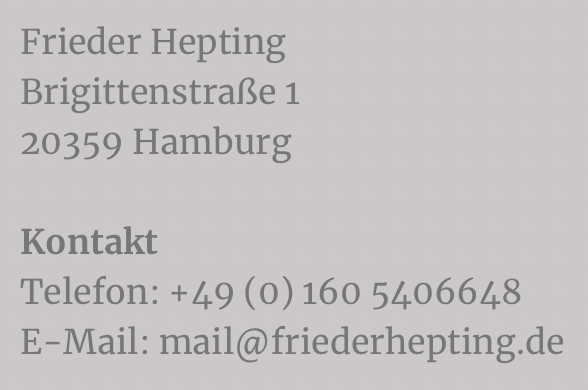 Nach geltendem Recht sind wir verpflichtet, Verbraucher auf die Existenz der Europäischen Online-Streitbeilegungs-Plattform hinzuweisen, die für die Beilegung von Streitigkeiten genutzt werden kann, ohne dass ein Gericht eingeschaltet werden muss. Für die Einrichtung der Plattform ist die Europäische Kommission zuständig. Die Europäische Online-Streitbeilegungs-Plattform ist hier zu finden: http://ec.europa.eu/odr. Unsere E-Mail lautet: mail@friederhepting.de